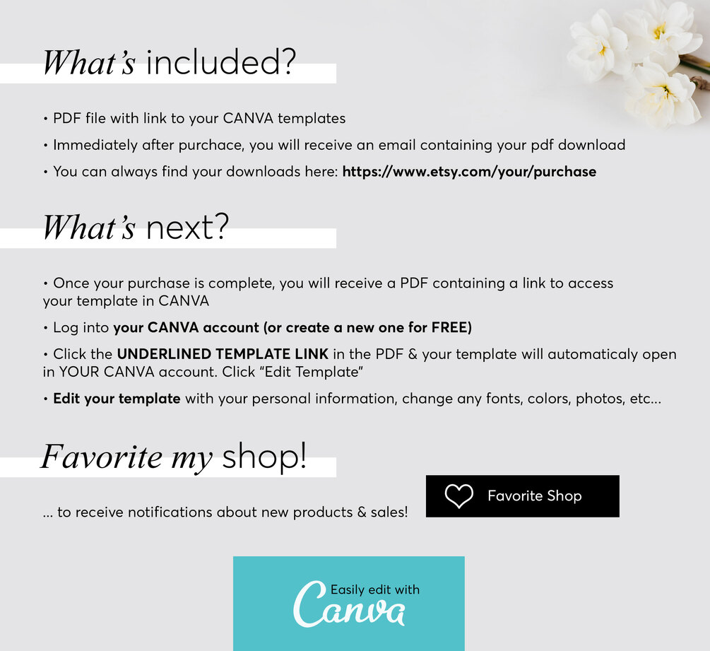 Once your purchase has been made, you can Instant Download a pdf file which included a link to edit the templates.